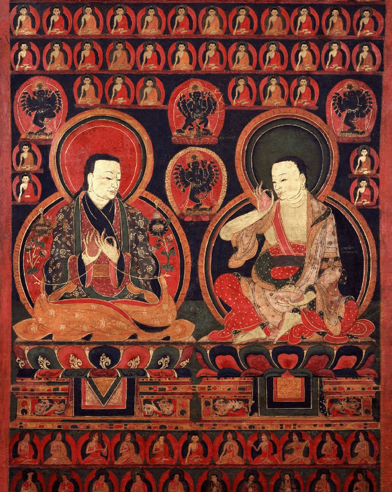 The Marpa Kagyu tradition originated in the eleventh century with the Tibetan translator Marpa Chokyi Lodro, who studied in India with Nāropa. Marpa’s disciple Milarepa famously attained enlightenment in the caves of southern Tibet after renouncing a life of violent revenge; his disciple Gampopa merged the lay siddha practice of his master with the Kadampa monasticism and scholarship that he had previously studied. Gampopa founded the first Kagyu monastery, Daklha Gampo in southern Tibet. Following Gampopa the tradition split into multiple autonomous subsects known as the four primary (Barom, Pakdru, Karma, and Tselpa), and eight secondary traditions (Drigung, Drukpa, Martsang, Shukseb, Taklung, Tropu, Yabzang, and Yelpa Kagyu), established by disciles of Pakmodrupa. The Drukpa Kagyu is further divided into Upper, Middle, and Lower. In addition to the above system, the Ngok (rngog) lineage begun by Ngok Choku Dorje, a disciple of Marpa, was a distinct Marpa Kagyu tradition that existed independently for several centuries. Also often considered an independent tradition was the Aural Lineage of Rechungpa, initiated by the disciples of Milarepa’s disciple Rechung Dorje Drakpa. The Barawa Kagyu tradition is considered a sub-branch of the Yanggon Kagyu, itself an offshoot of the Upper Drukpa. All Marpa Kagyu traditions claim allegiance to the tantric teachings of the Indian Mahāsiddha tradition, primarily that of Nāropa, in the form of the Six Yogas of Nāropa and the doctrine of Mahāmudrā. The Kagyu were also heavily involved in the transmission of the Cakrasaṃvara, Hevajra, among other tantras of the Second Propagation era.
